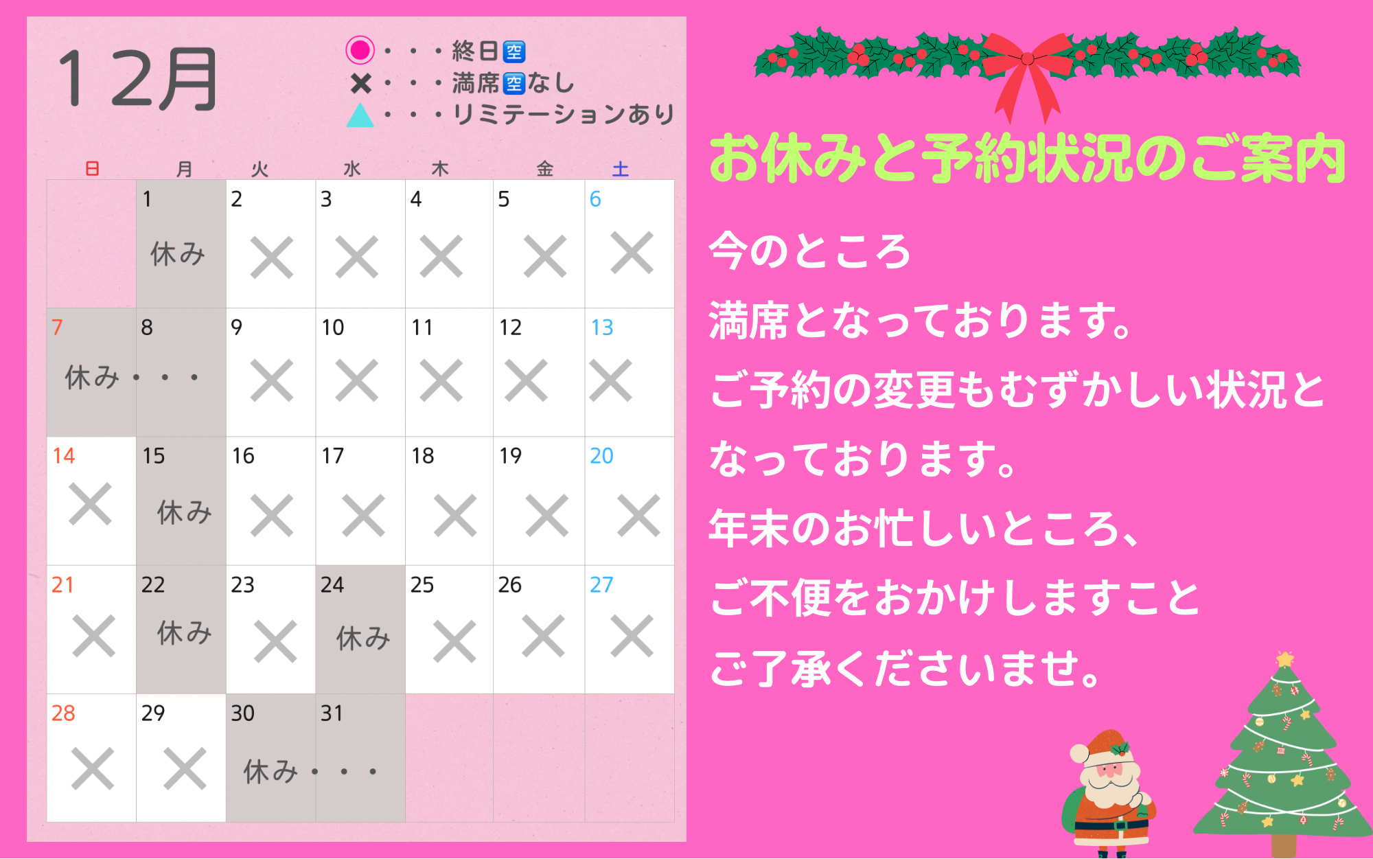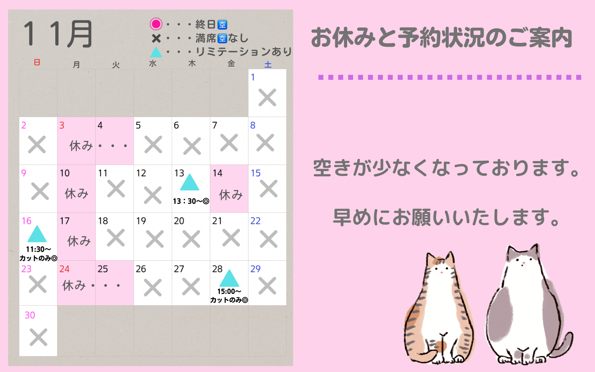 WEB予約でこまめにチェックしていただくか、お気軽にお問い合わせ・ご希望お申し付けください。