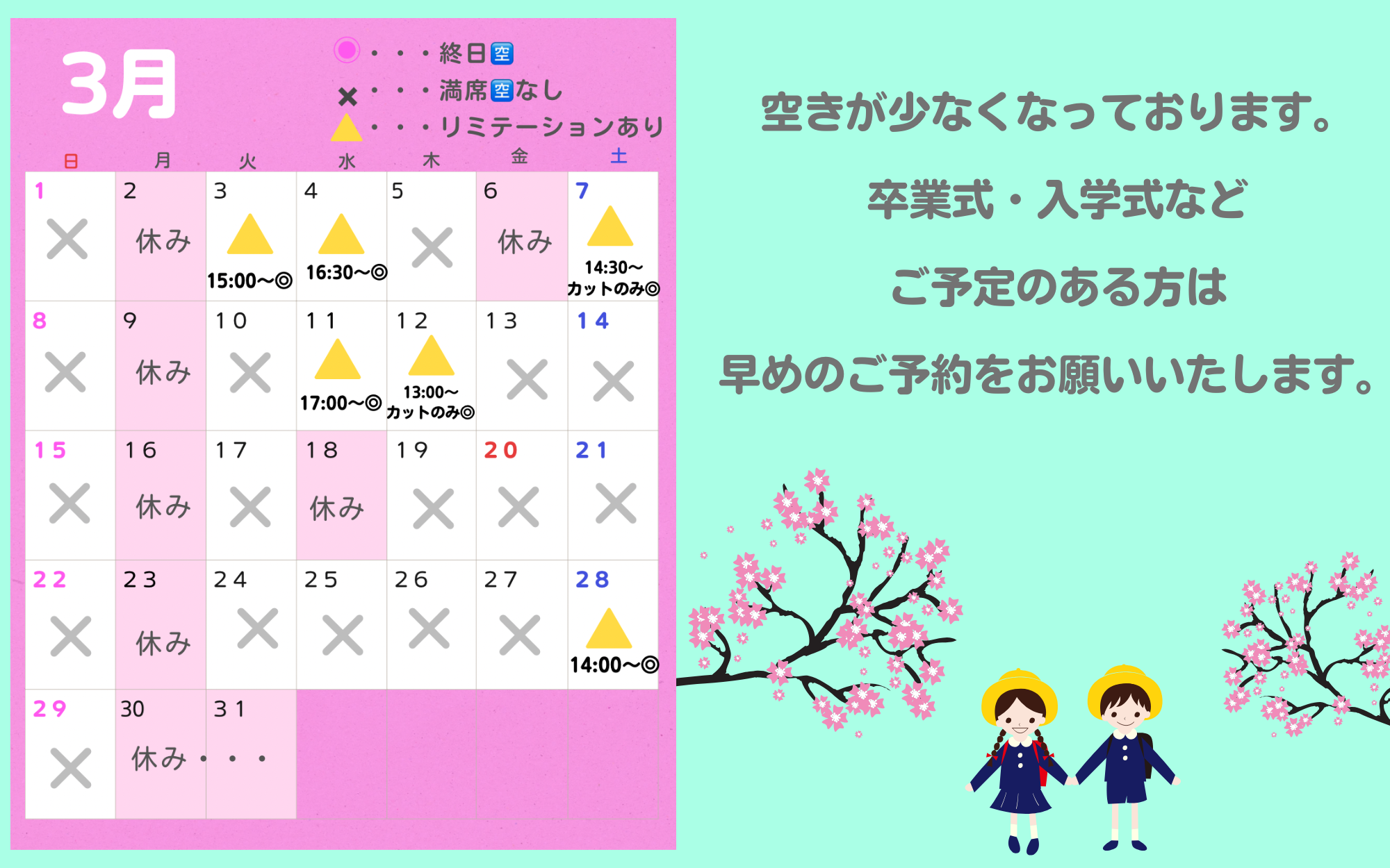 卒園・卒業式などのご予定があるお客さまを中心に、ポツポツとご予約が入ってまいりましたのでご案内させていただいております。