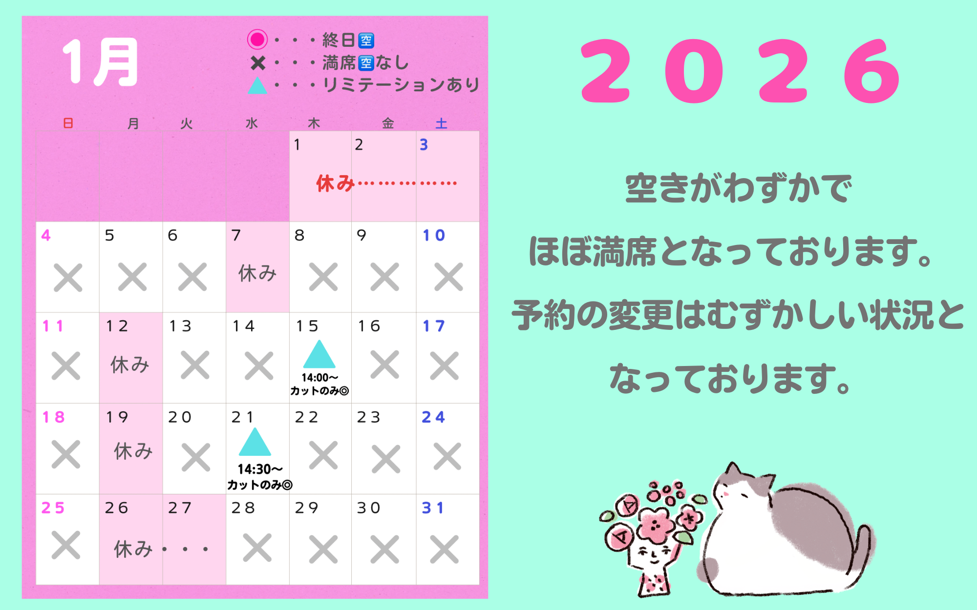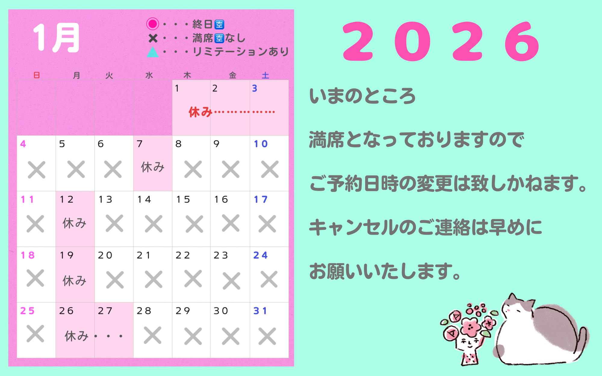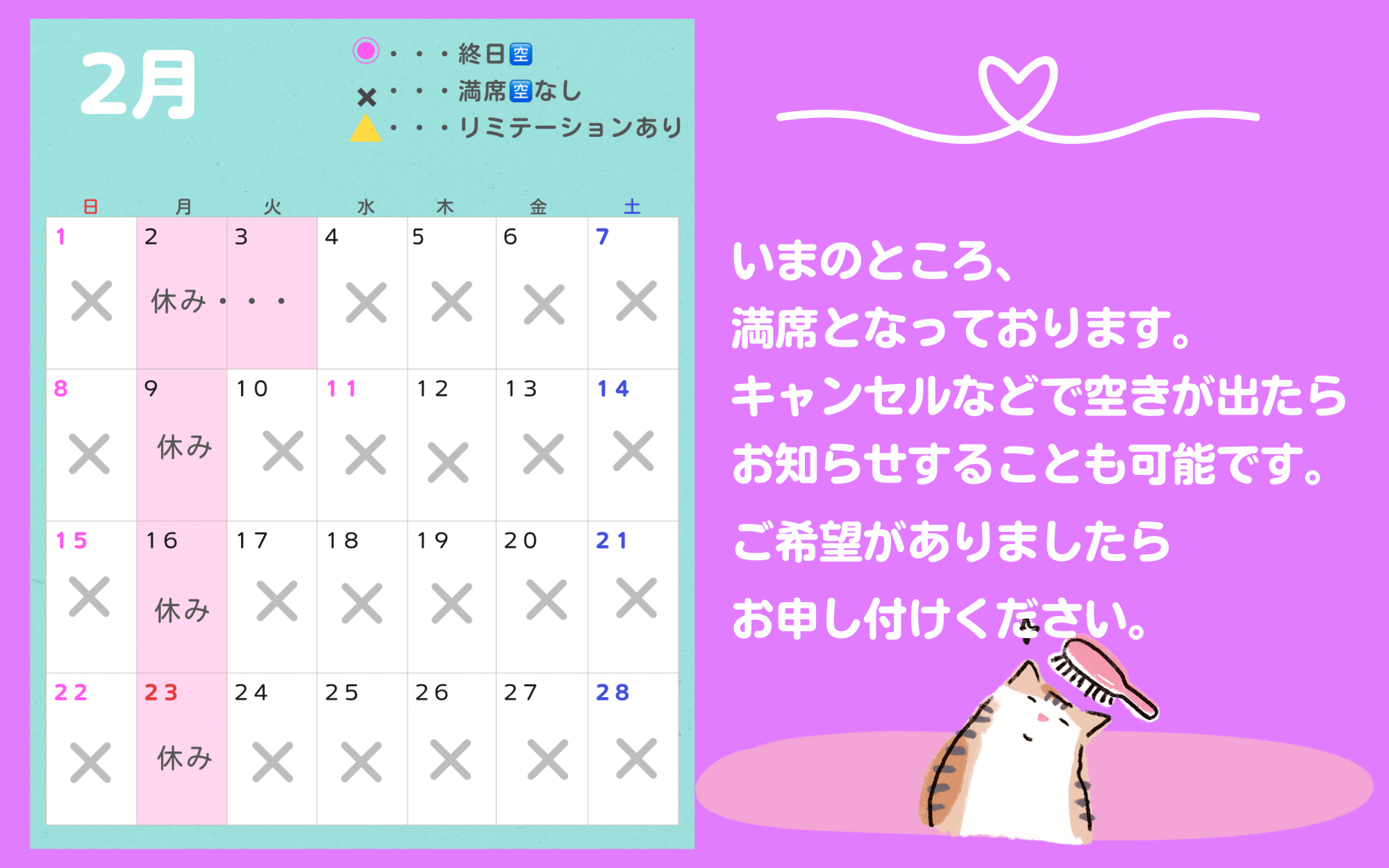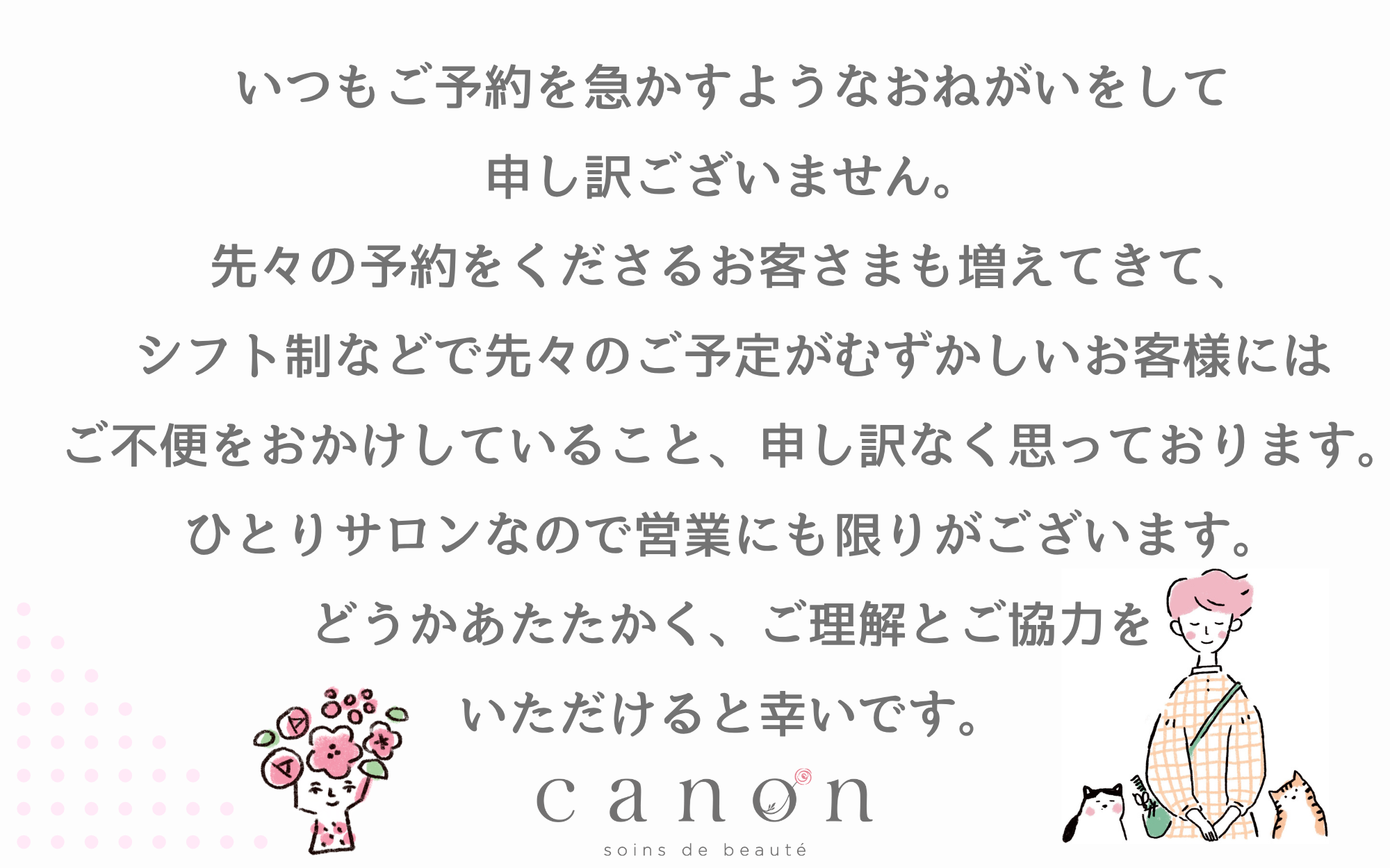予約状況に合わせて、カノンのお休みも変更になることもあります。